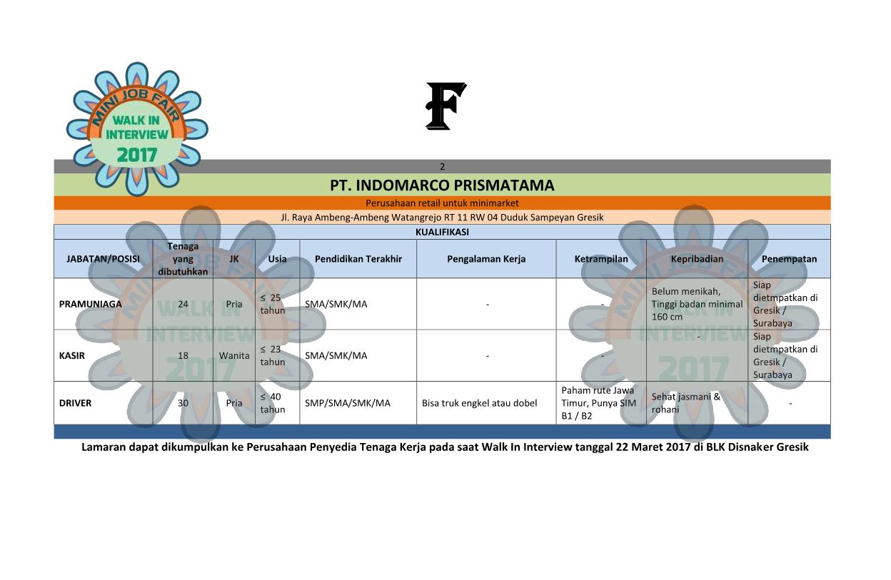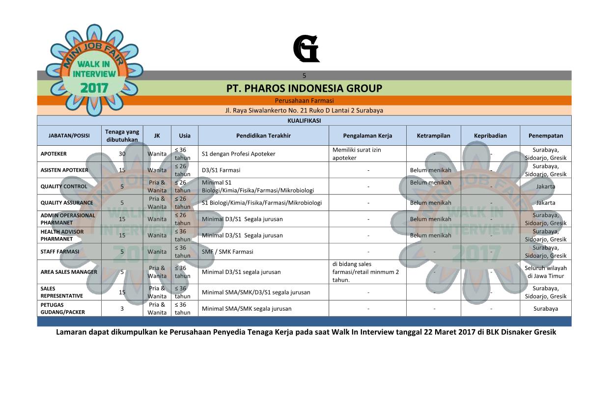 Berikut daftar lowongan pekerjaan yang ditawarkan dalam acara Gresik Walk Interview 2017 – Mini Job Fair yang digelar oleh Dinas Tenaga Kerja Kabupaten Gresik, pada hari Rabu 22 Maret 2017. Berlokasi di Balai Latihan Kerja (BLK) Jl Proklamasi Gresik.