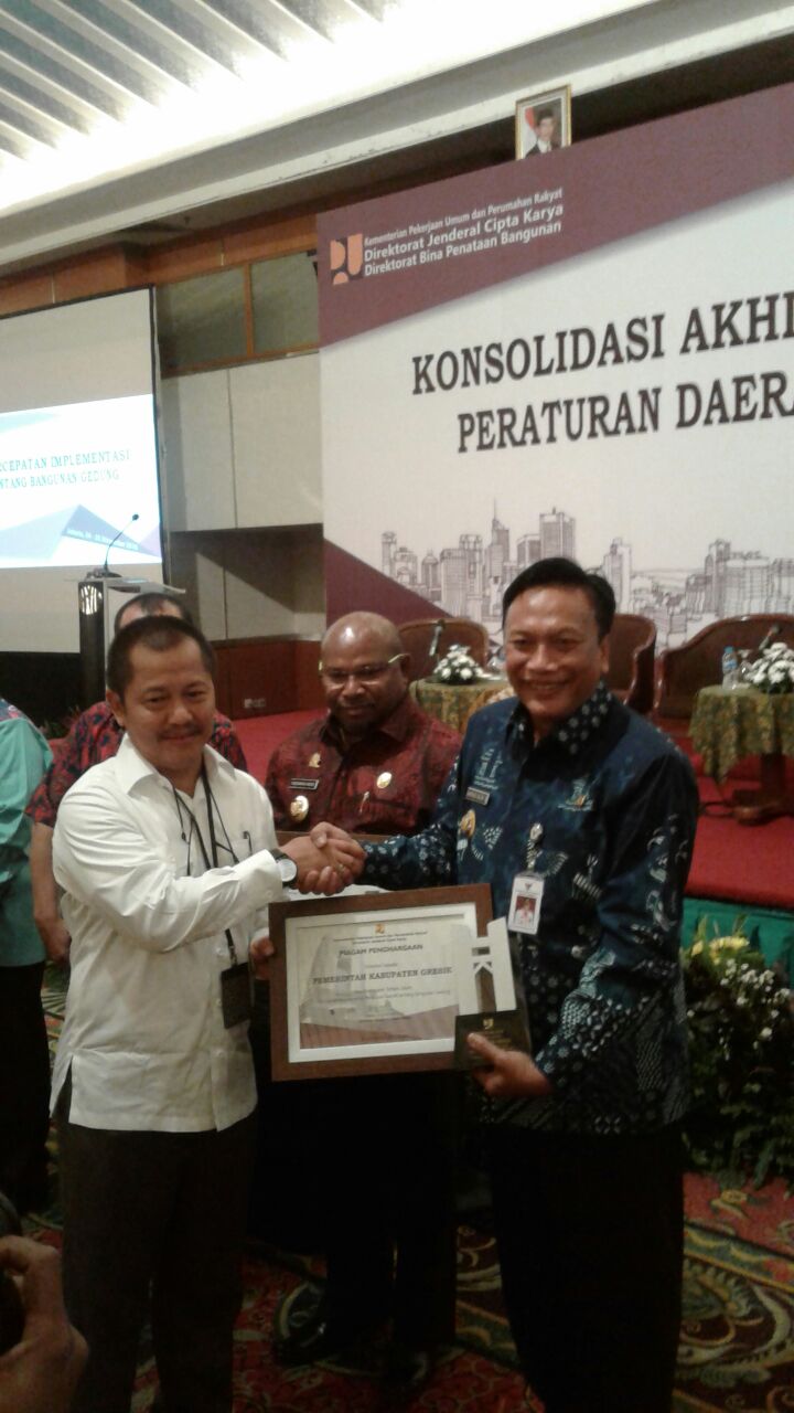 Kabupaten Gresik, Jawa Timur terpilih sebagai kabupaten terbaik dalam implementasi Peraturan Daerah Bangunan Gedung, dan menerima penghargaan dari Menteri Pekerjaan Umum Dan Perumahan Rakyat (PUPR), Basuki Hadimuljono di Puri Agung Grand Sahid Jaya Hotel Jakarta, Kamis.