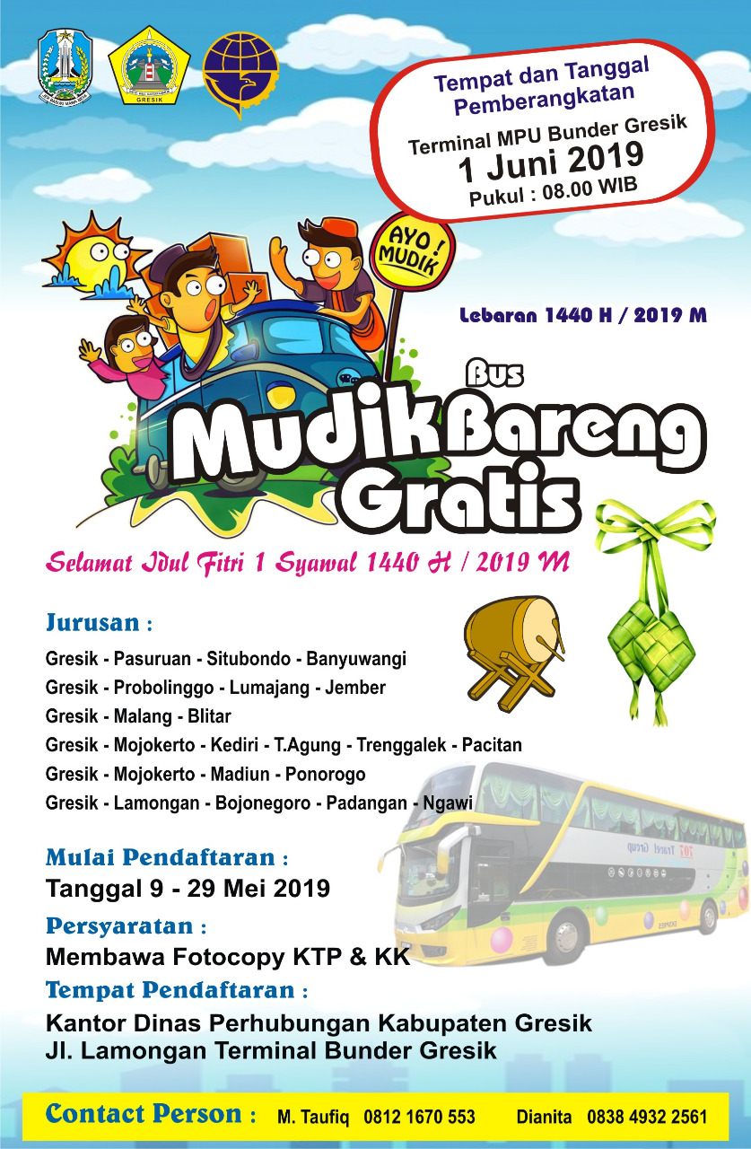 Kabar gembira bagi pemudik dari Gresik, mulai tanggal 9 – 29 Mei 2019 dibuka pendaftaran mudik gratis. Bagi peminat bisa langsung datang ke Dishub Gresik dengan membawa KK dan KTP sebagai persyaratan.