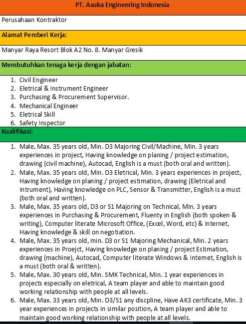 PT Asuka Engineering Indonesia merupakan perusahaan kontraktor yang beralamat di Manyar Raya Resort Blok a2 No 8 Manyar Gresik membutuhkan : Civil Engineer, Electrical & Instrument Engineer, Purchasing & Procurement Supervisor, Mechanical Engineering, Electrical Skill, Safety Inspector