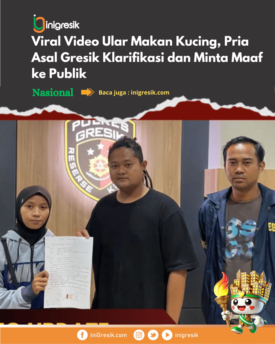 INIGRESIK.COM – Seorang pria bernama Angga yang sempat membuat gaduh media sosial karena video seekor ular yang diduga memakan kucing, akhirnya meminta maaf secara terbuka. Klarifikasi tersebut disampaikan bersama Ervina, pemilik kucing, di Polres Gresik.